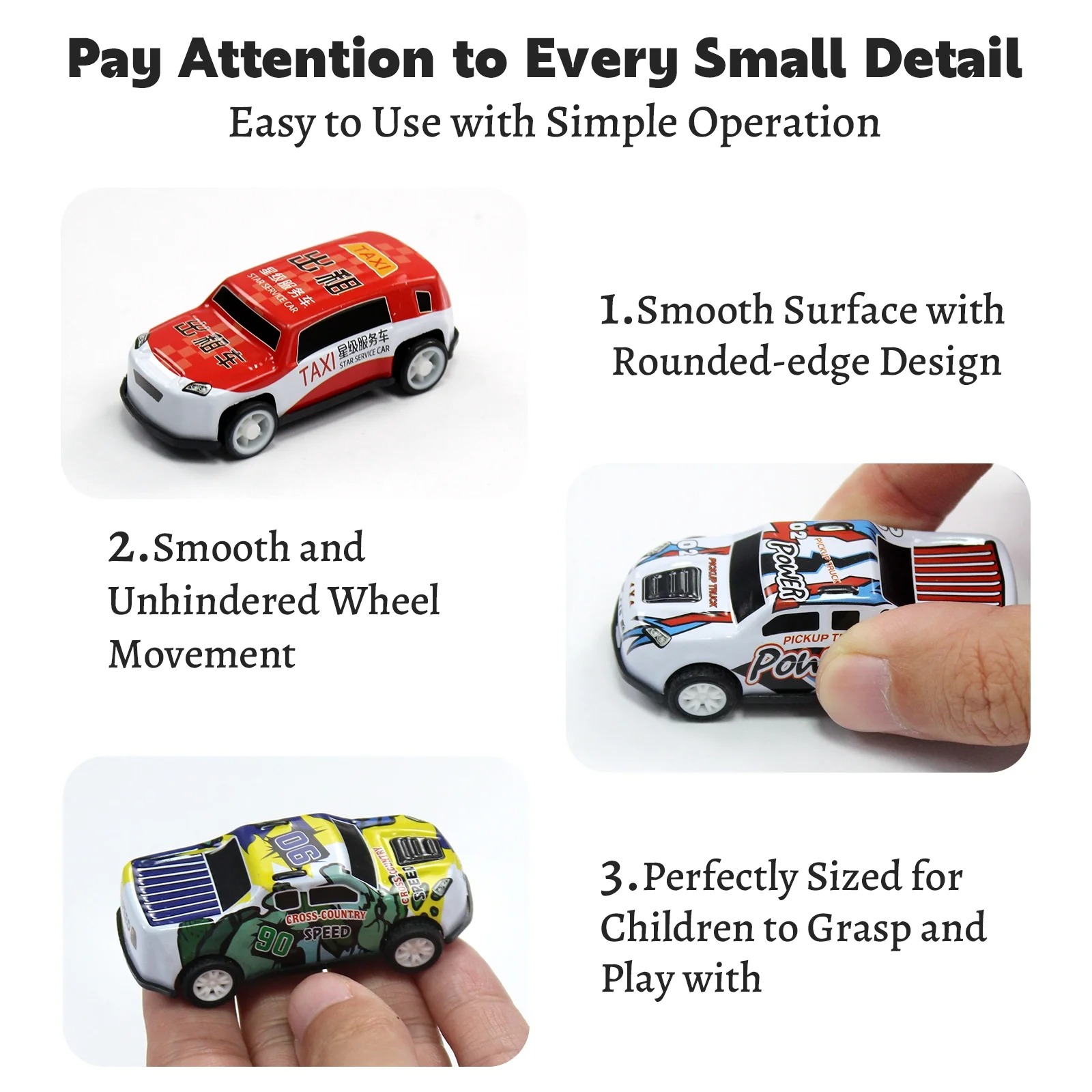 - 【Mini and Portable】: The size is about 2.6 inches, and a suitable size can make the mini toy car easy to hold and play with. These mini cars are very portable and can be put in pockets or bags as perfect travel toys. Children can play with them at any time.