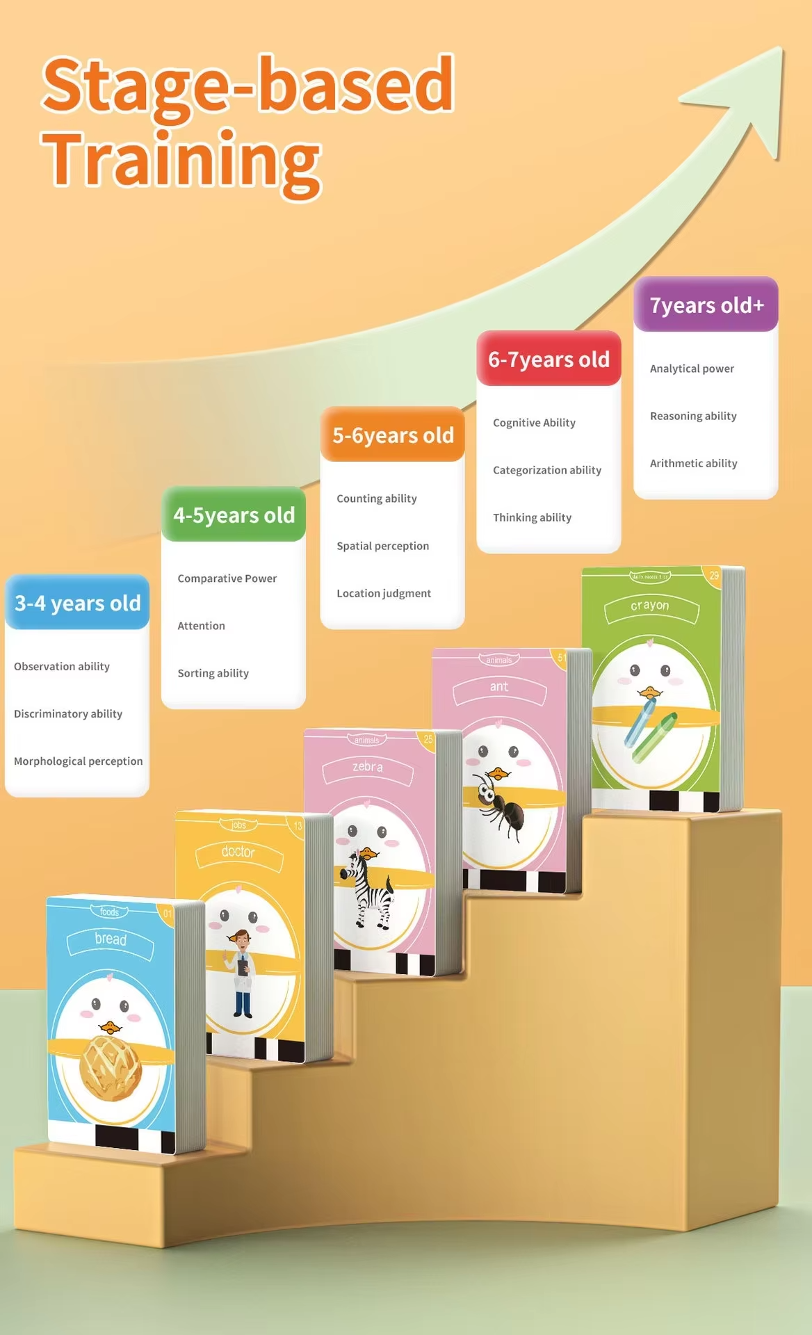 Our card has a unique double-sided design, each with a different pattern and vocabulary. Just insert the cards into the reading machine and it will start working. Press the repeat button to repeat the vocabulary and sound.